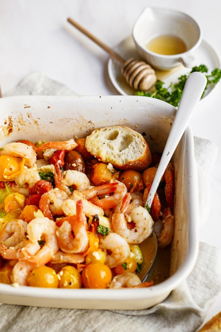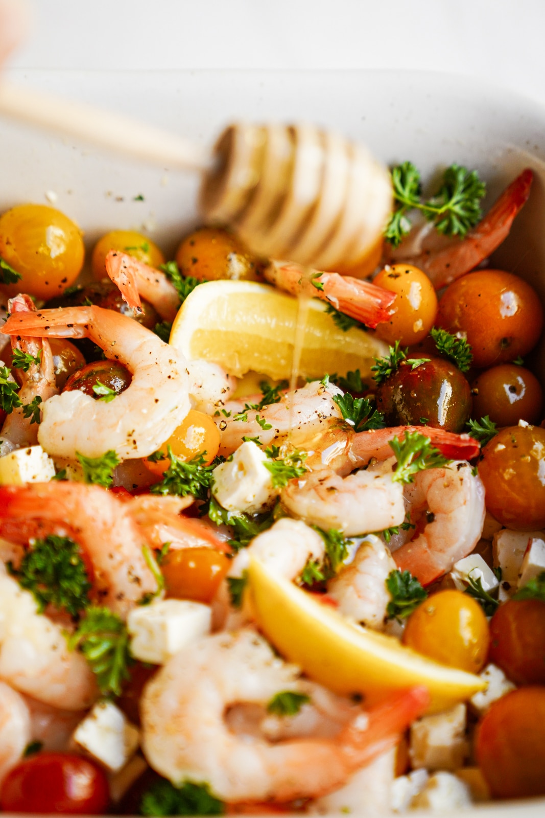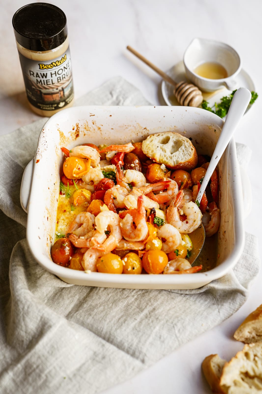 This Baked Honey Garlic Shrimp with Feta is a quick and flavour-packed dish that’s perfect for busy weeknights or effortless entertaining. Juicy shrimp are tossed in a savoury-sweet mix of olive oil, garlic, and BeeMaid Honey, then baked to perfection with cherry tomatoes, lemon slices, and a pinch of chili flakes for subtle heat. Crumbled feta adds a creamy, tangy finish, while fresh parsley brings a burst of brightness. Ready in minutes and loaded with bold, balanced flavour, this easy honey garlic shrimp recipe is a delicious way to elevate your family dinners.
