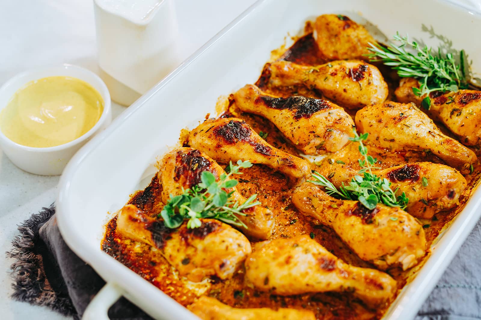 1.Place chicken drumsticks in a large, lightly greased casserole dish. Whisk together all remaining ingredients.