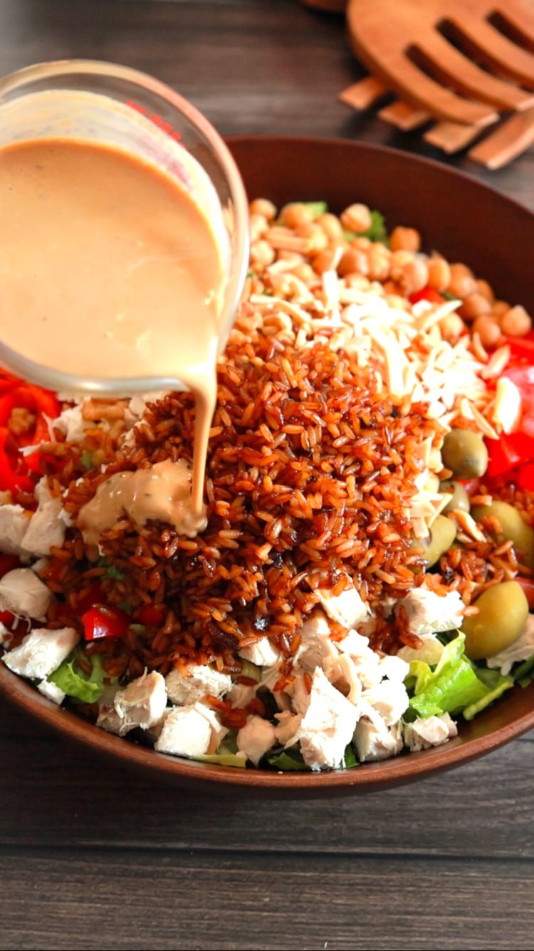 3. In a large salad bowl, add the lettuce, chickpeas, chicken, tomato, avocado, pepper, feta, artichoke hearts, olives, nuts and crispy rice. When ready to serve, pour the salad dressing over top. Mix and enjoy!