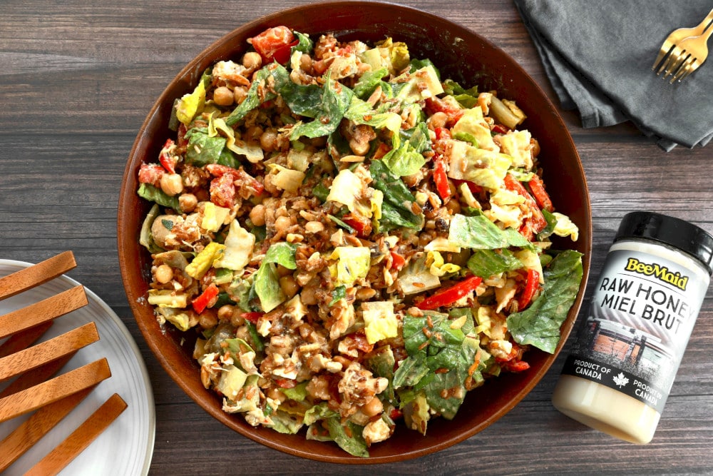 Mediterranean Honey Balsamic Chicken Bowl is a hearty, nutrient-packed meal layered with bold Mediterranean flavors and balanced textures. At its heart is a creamy honey balsamic dressing made with Greek yogurt, Bee Maid Raw Honey, balsamic vinegar, Dijon mustard, and garlic—bringing a tangy-sweet richness that ties the whole bowl together. Perfect as a wholesome lunch or dinner, this bowl delivers a delicious fusion of sweet, savory, creamy, and spicy elements in every bite.